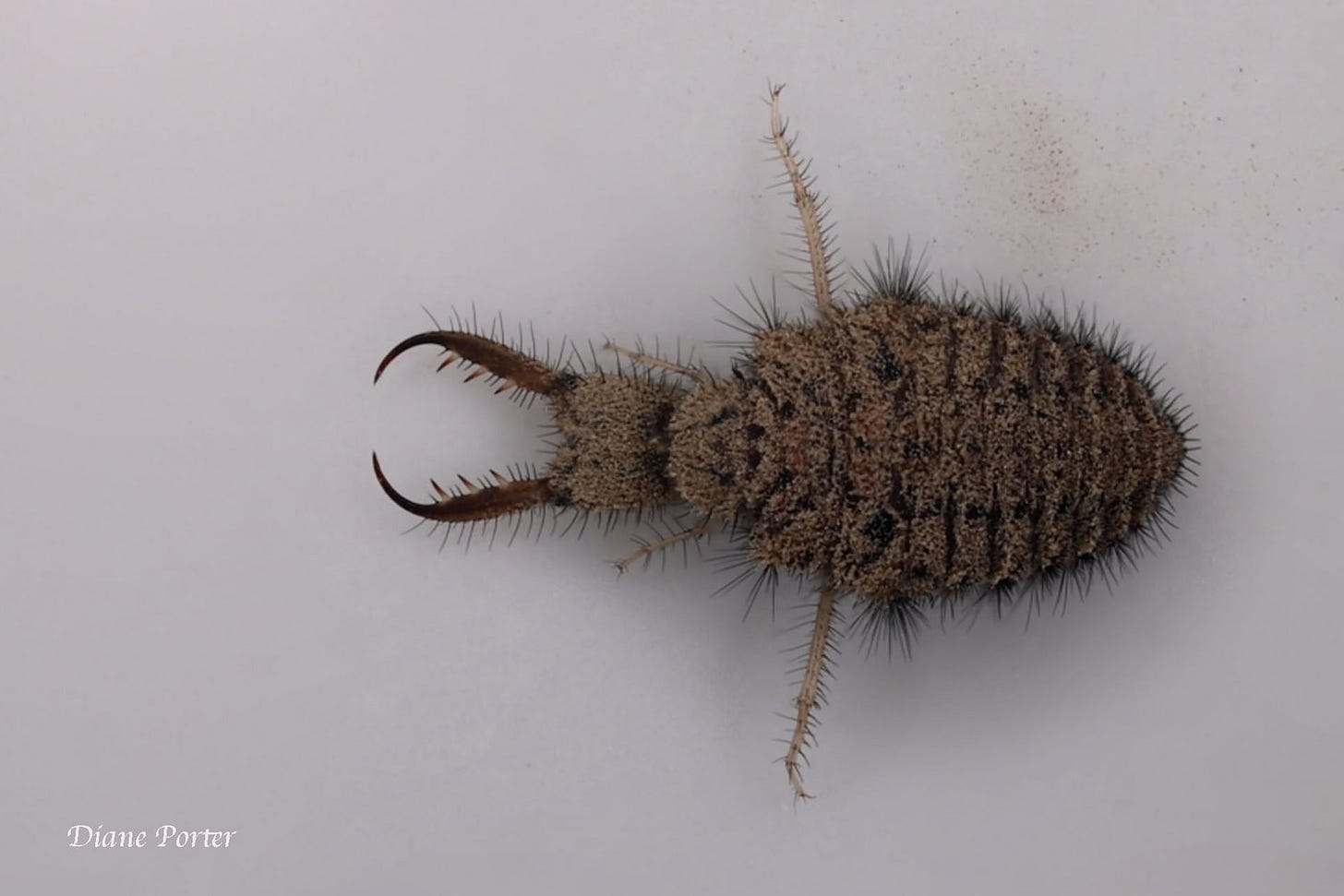 Here’s a picture of antlion through my microscope. It is spiny everywhere, but it feels soft to human skin. Look at those amazing pincers!