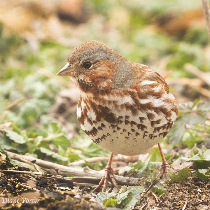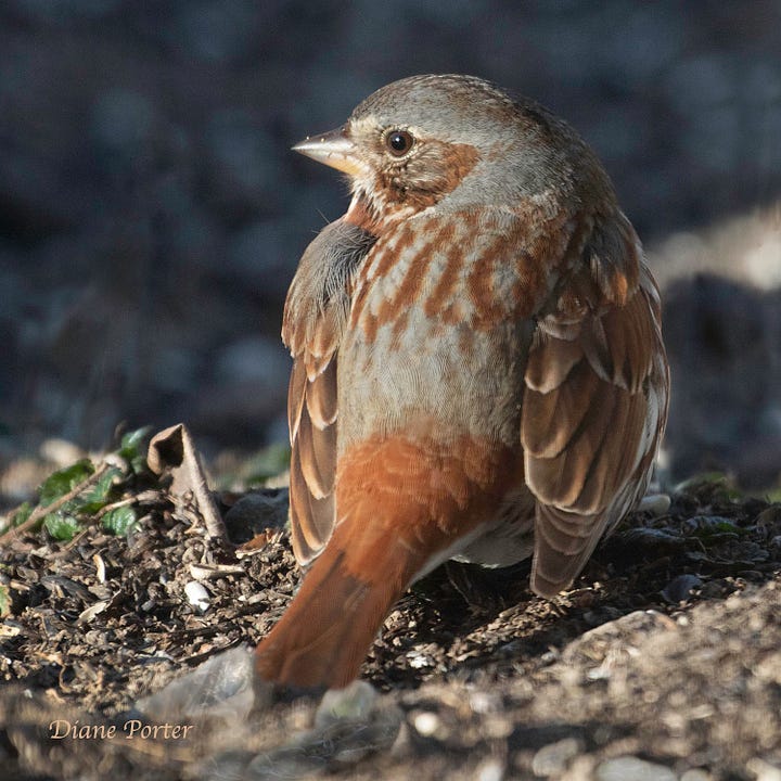 Now, seeing that russet rump/tail, I know why this little guy is called a Fox sparrow--always wondered, never thought to look it up. Ours left about a month ago, heading in your direction.