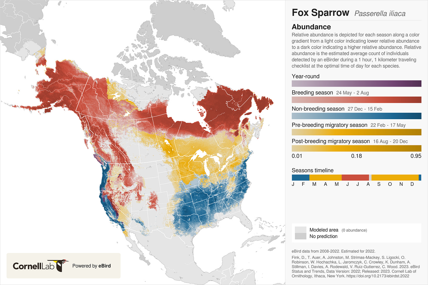 You may wish to visit an animated map showing the Fox Sparrow’s travels throughout the year. Click the Weekly button near the name Fox Sparrow. Find and hit the blue-and-white arrow. Wow.