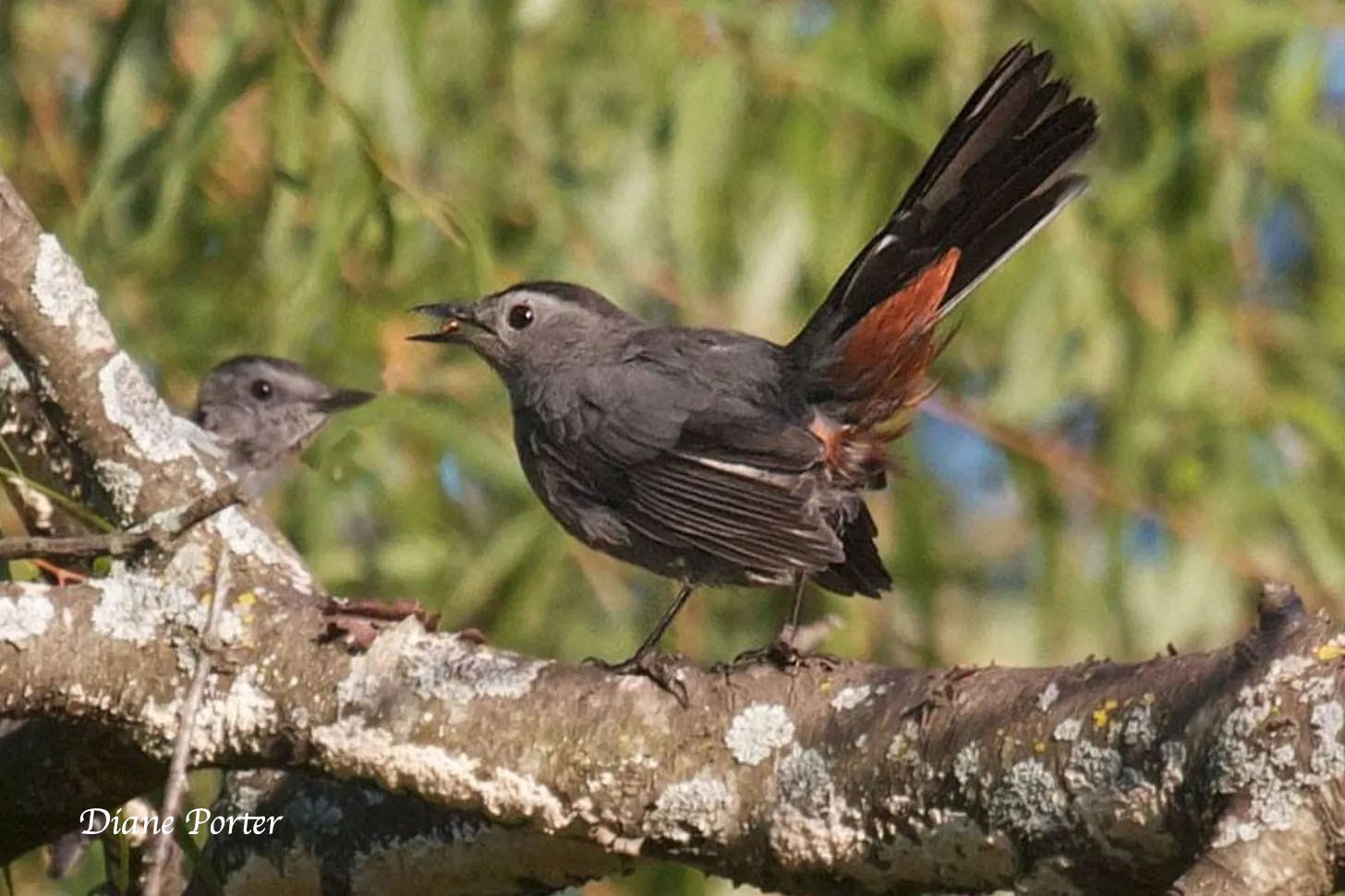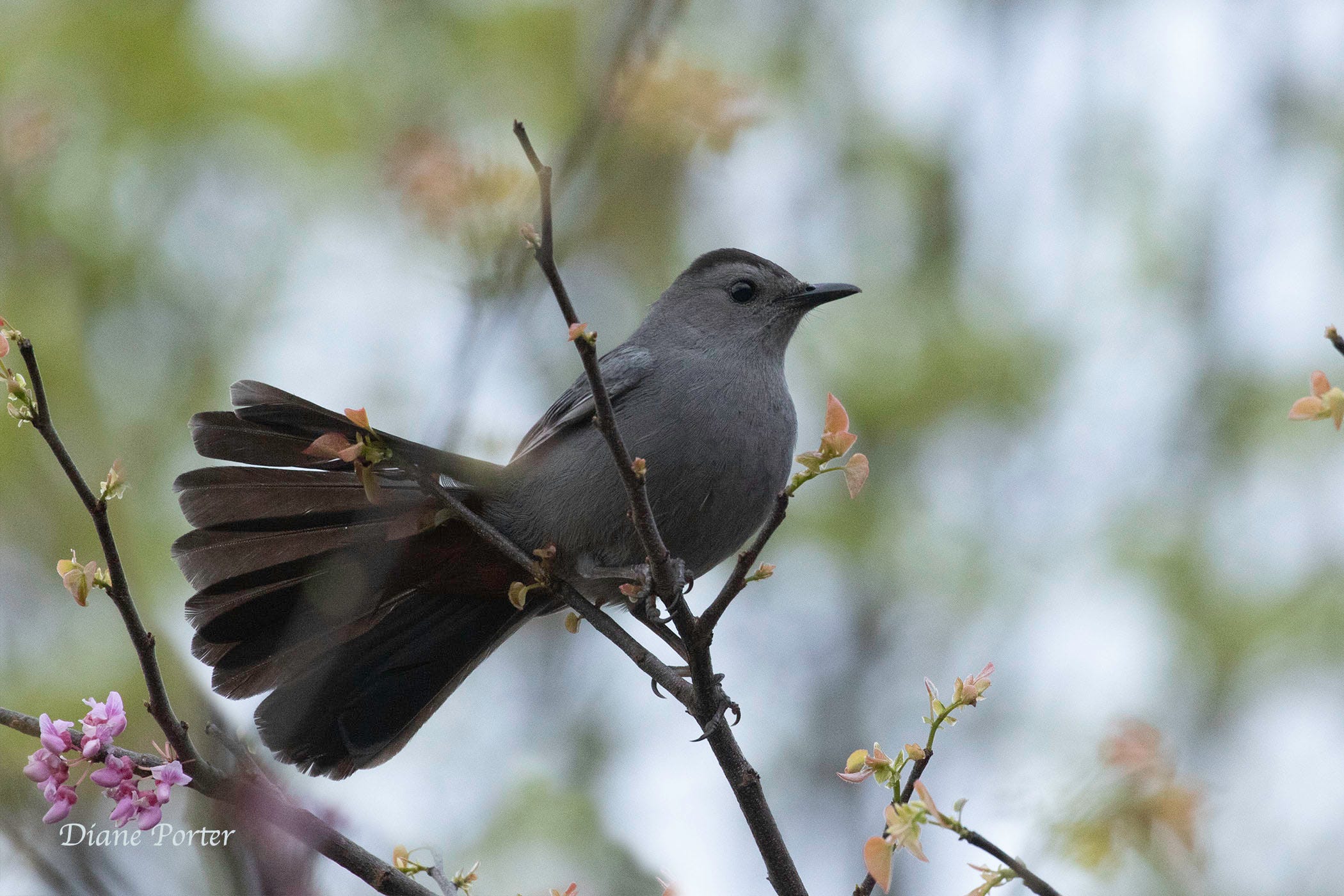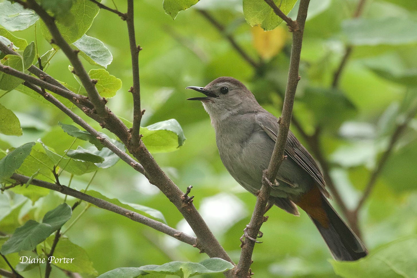 Gray Catbirds are not entirely gray. The cap is black and contrasts decoratively. More impressive, the birds hide their finest decoration where it is seldom seen, on the feathers that cover the base of the tail’s underside: rufous-colored, raw-silk undertail coverts.