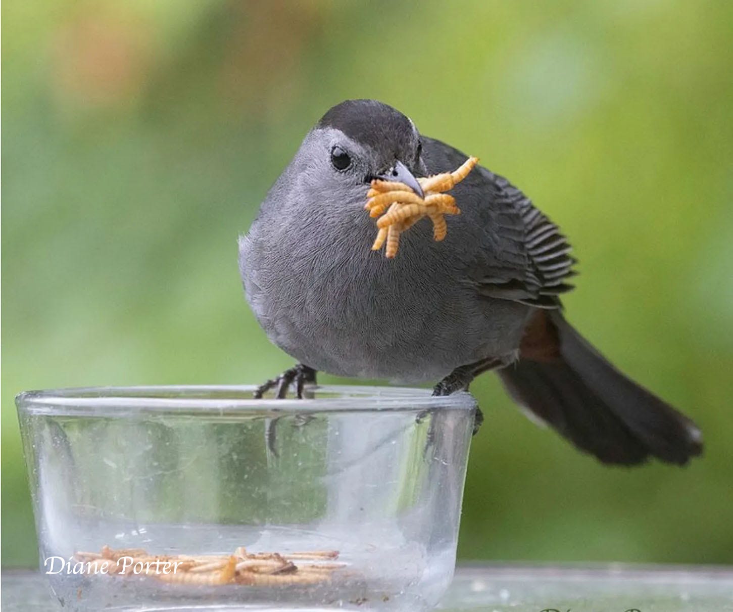 She’s right back as soon as I put out the live food. I can’t tell her from another catbird or even guess her gender. But she seems to know all about me. Clearly this is a bird who observes.