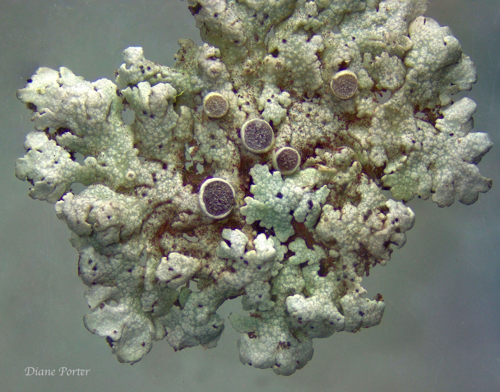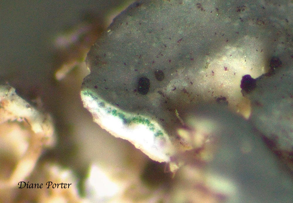 When I put a piece of a Hoary Rosette lichen under the microscope, I noticed a broken lobe. Focusing on the raw edge, I saw a layer of green dots just under the skin-like surface. In a flash of recognition I realized these green dots must be the lichen’s photobiont!