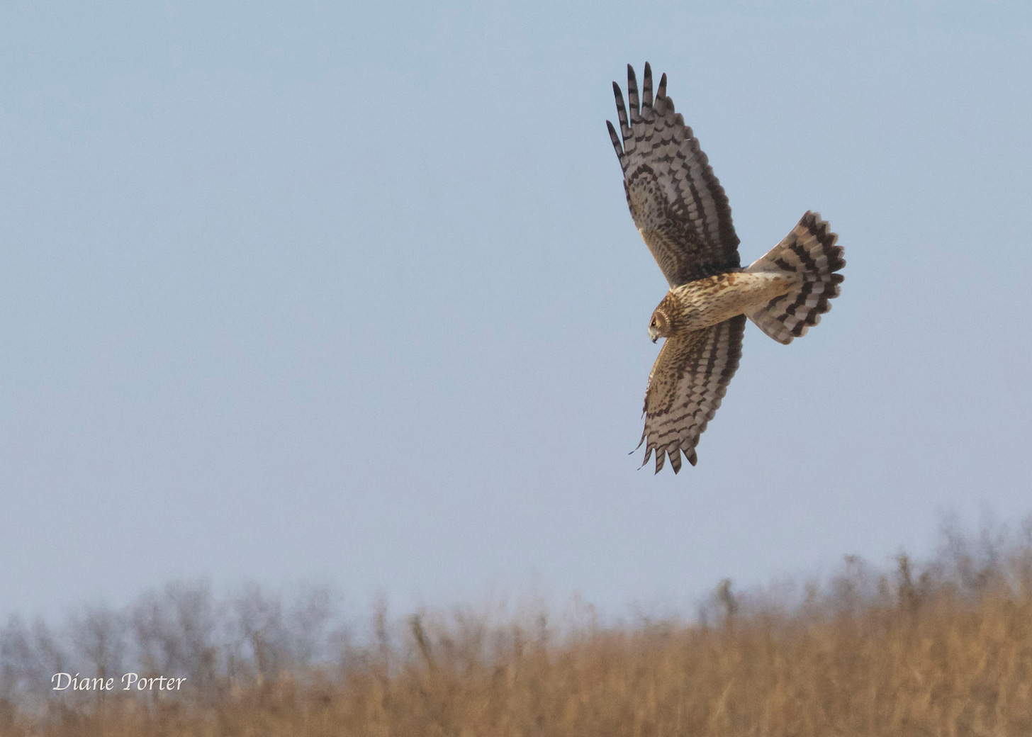 Back and forth she flies, looking downward. She quarters the field, searching, left-to-right, then right-to-left. She’s looking for small prey — mostly mice — who are preoccupied with their own lives and not aware of her yet.