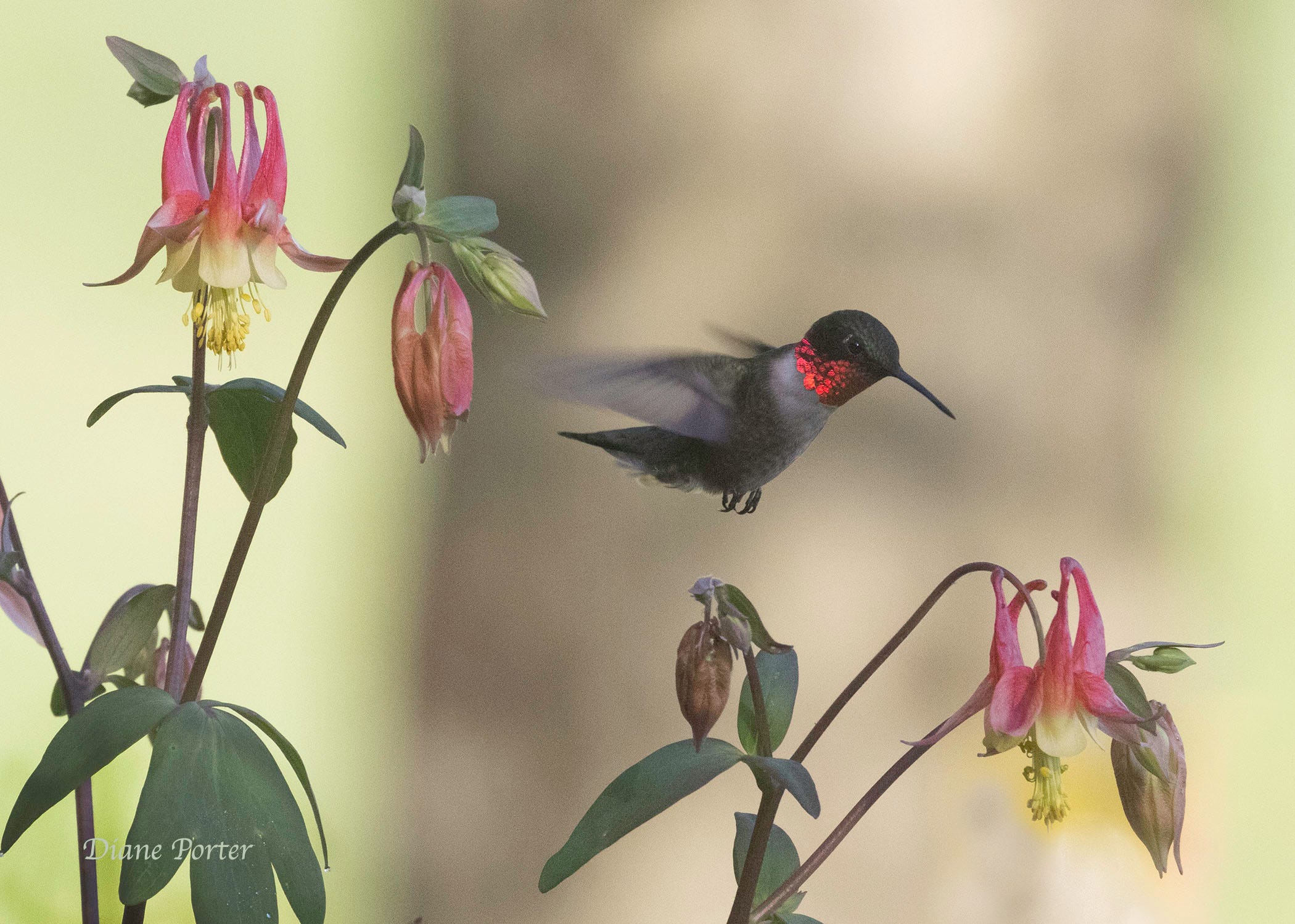 I heard the hum before I saw the bird. I’ve been looking for him for a week. The first Ruby-throated Hummingbird of the spring hovered right beside me this morning and sipped from a Red Columbine. The hummingbird always shows up within days of the first blossom’s opening. He was a male, with a gorget of fire coals.