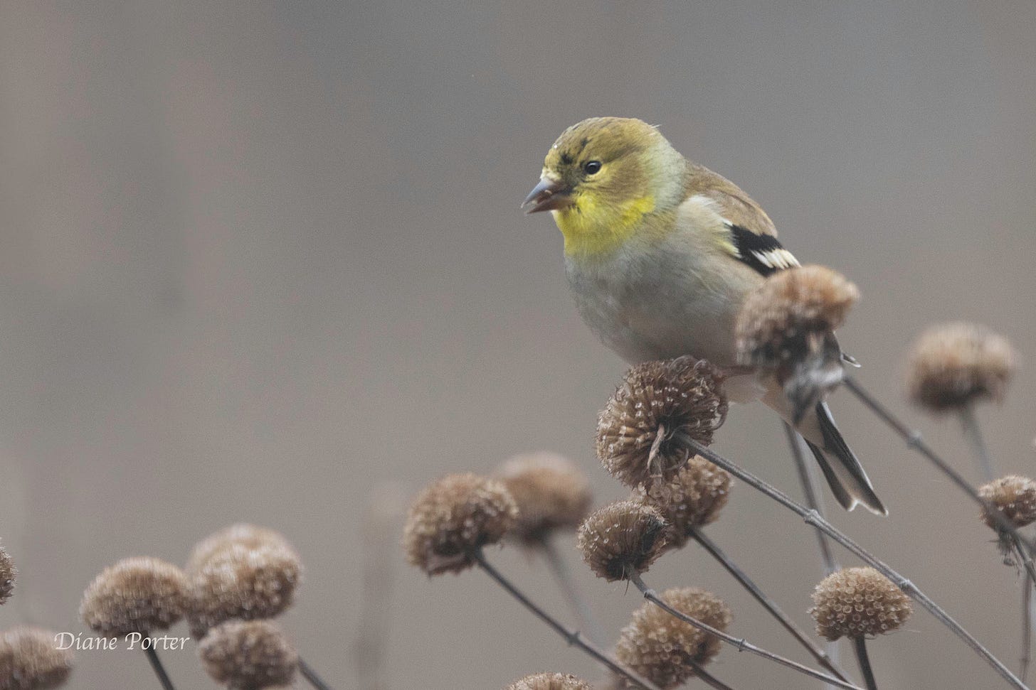The bergamot is dry and brittle. The goldfinches are drab now, too. On their throats, the males have only a trace of the shining gold their bodies wore last summer.