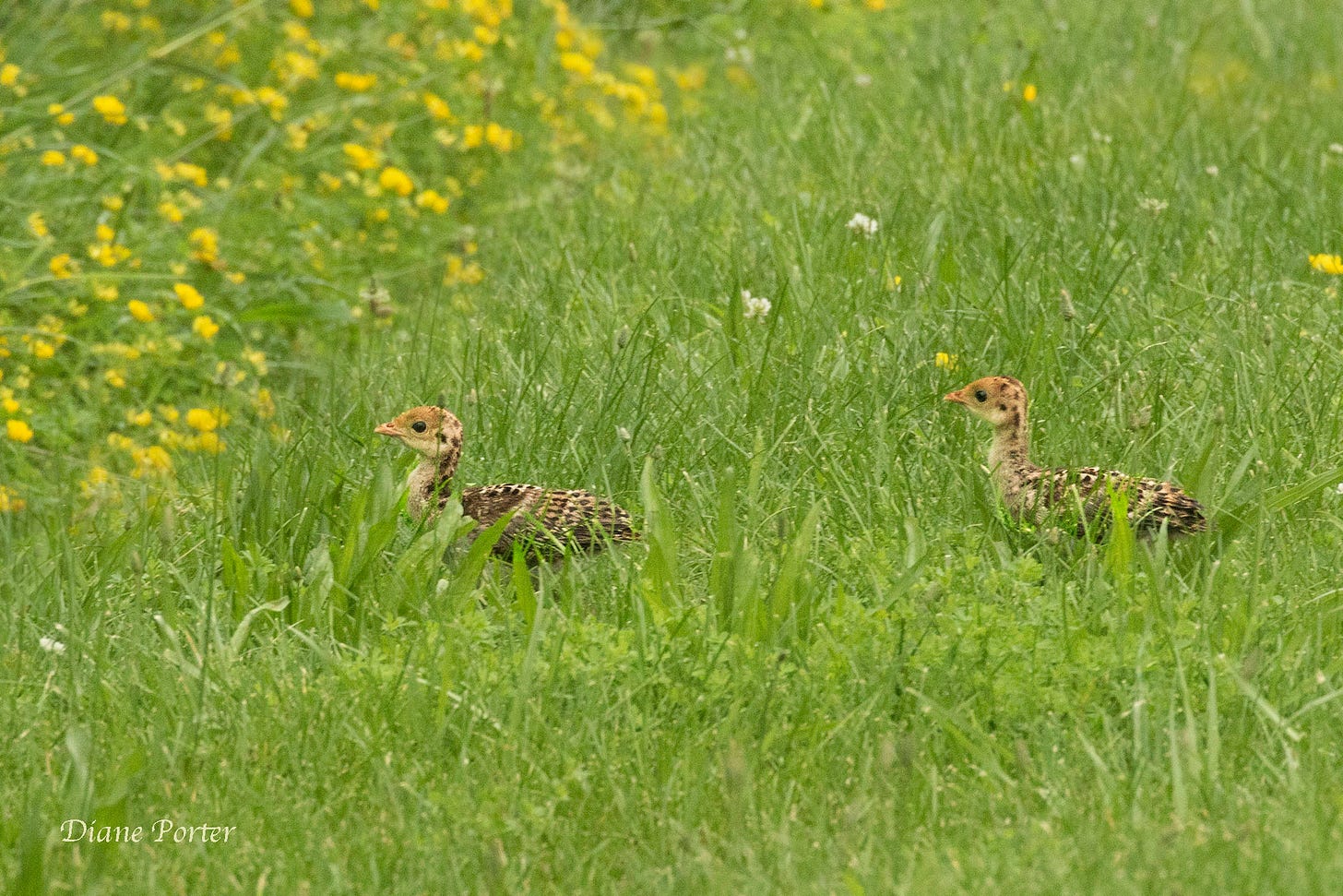 However, from the moment they hatch, the babies must peck up their own food. Because they need a lot of protein, they eat mostly insects and spiders they find in the grass. Gradually they transition to eating more seeds, berries, acorns, and grasses.