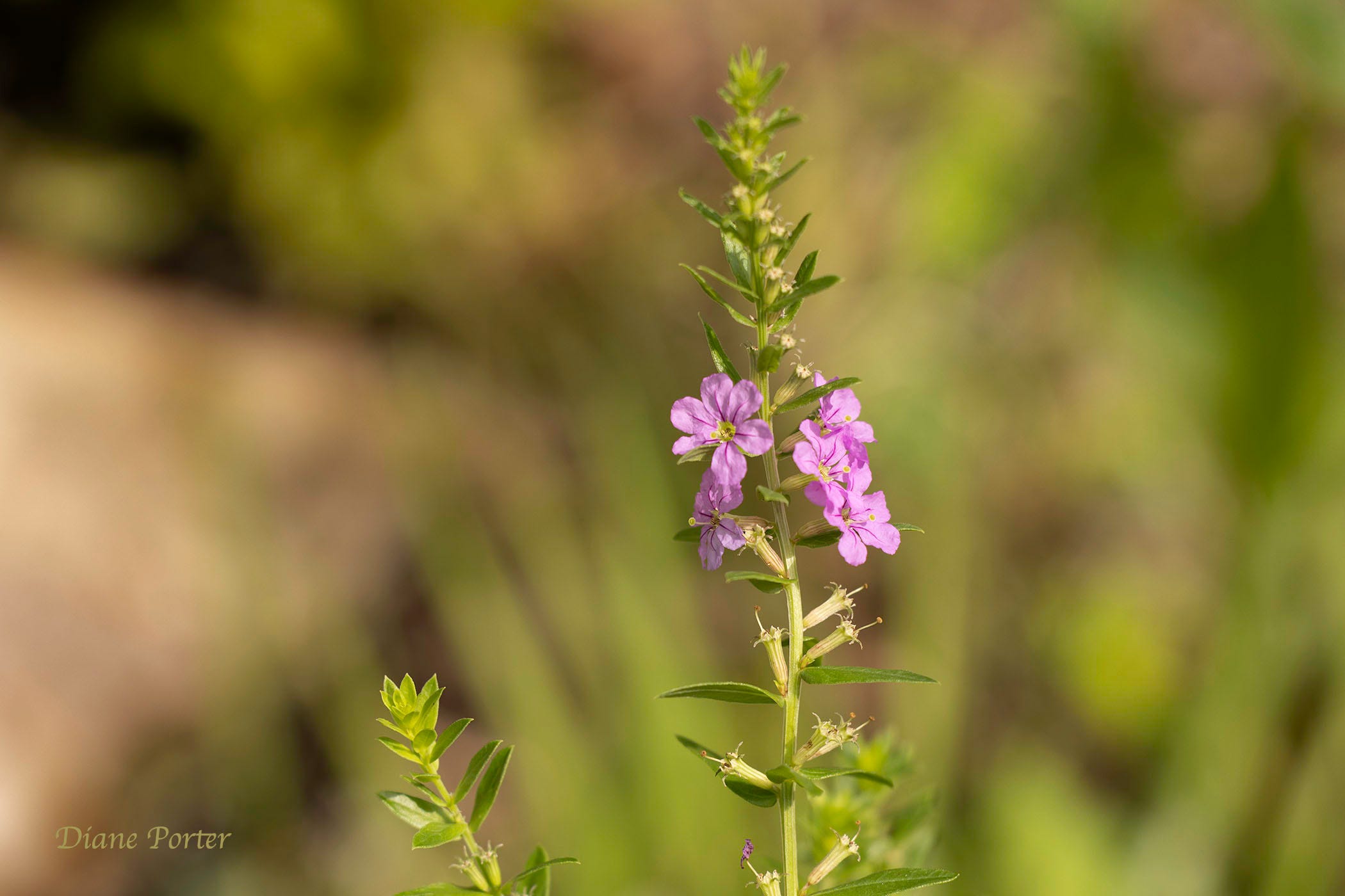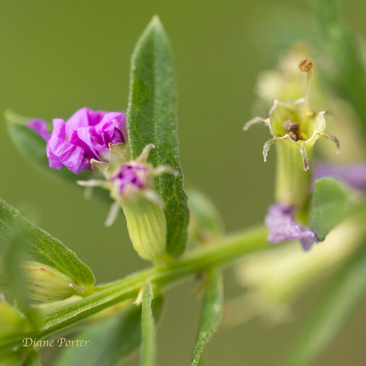 Only a few blooms open at a time on each stem. Winged Loosestrife’s flowers are so small you could hold a bouquet in your fingertips. The blossoms always look wrinkled, as if made from super-thin tissue paper.