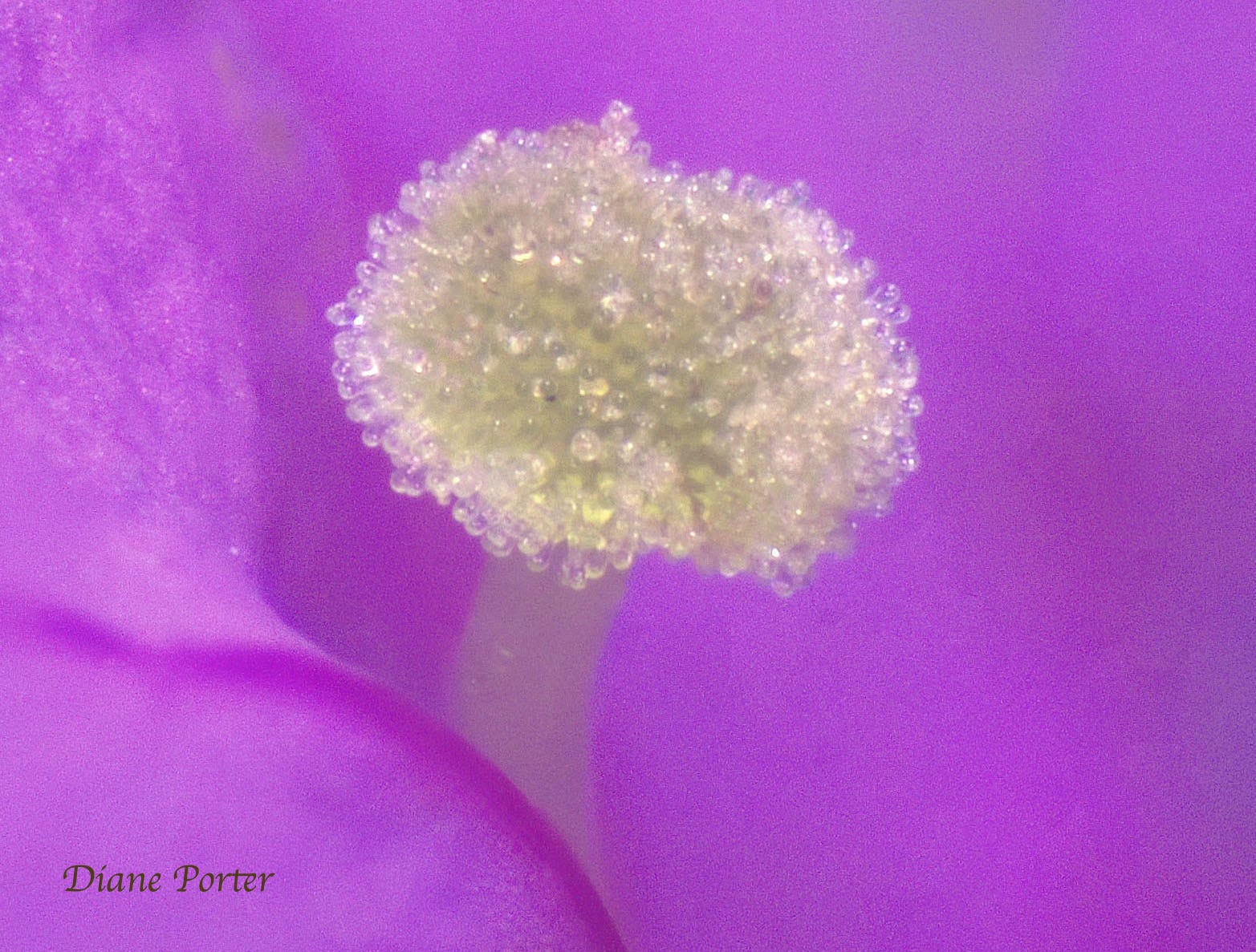 From the center of a flower, there emerges a long column, called the style, with a whitish cap at the end, called the stigma. The stigma looks moist. A microscope view resolves the style into a mass of transparent, gelatinous droplets. Slightly sticky, they catch and keep any grains of pollen that touch them.